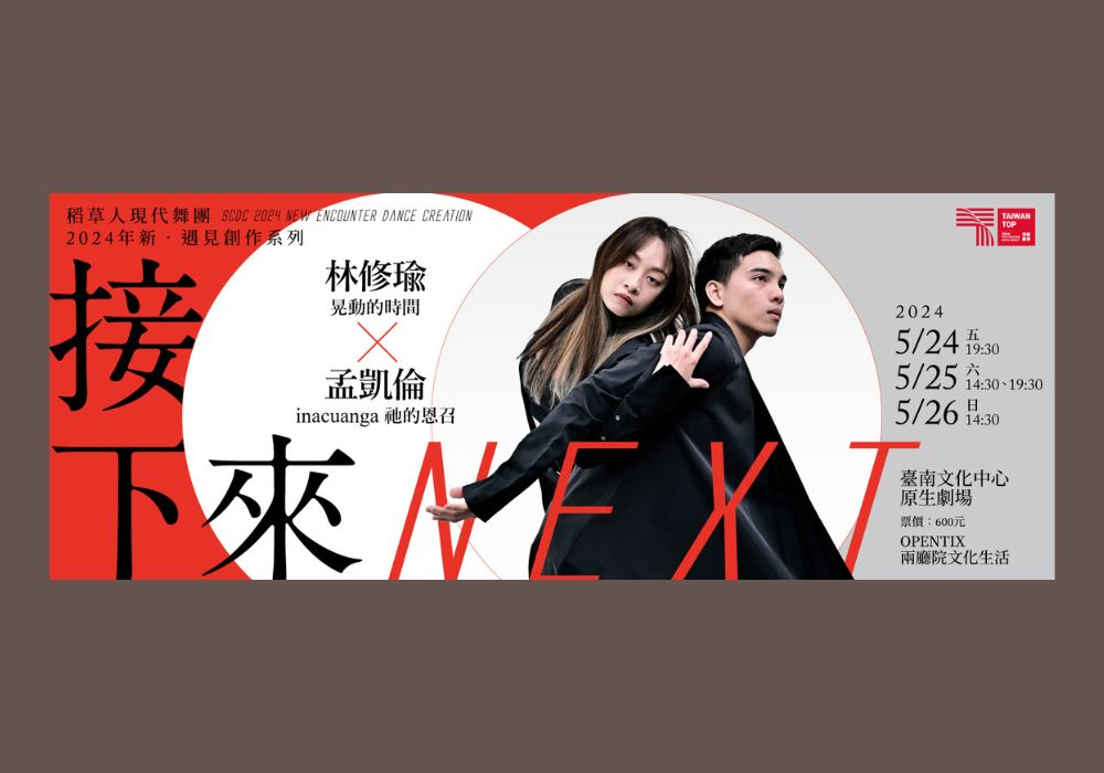 稻草人現代舞團2024年新‧遇見創作系列《接下來──》,原創性、前瞻性、突破性的新一代編創視野,自我主張的想法展現。林修瑜、孟凱倫兩位年輕編舞者將以貼近人們生活所熟悉的日常題材為發想,透過省思自我生命時間與提問性靈信仰的探究,呈現出屬於各自世代所關懷的創作議題與內涵。