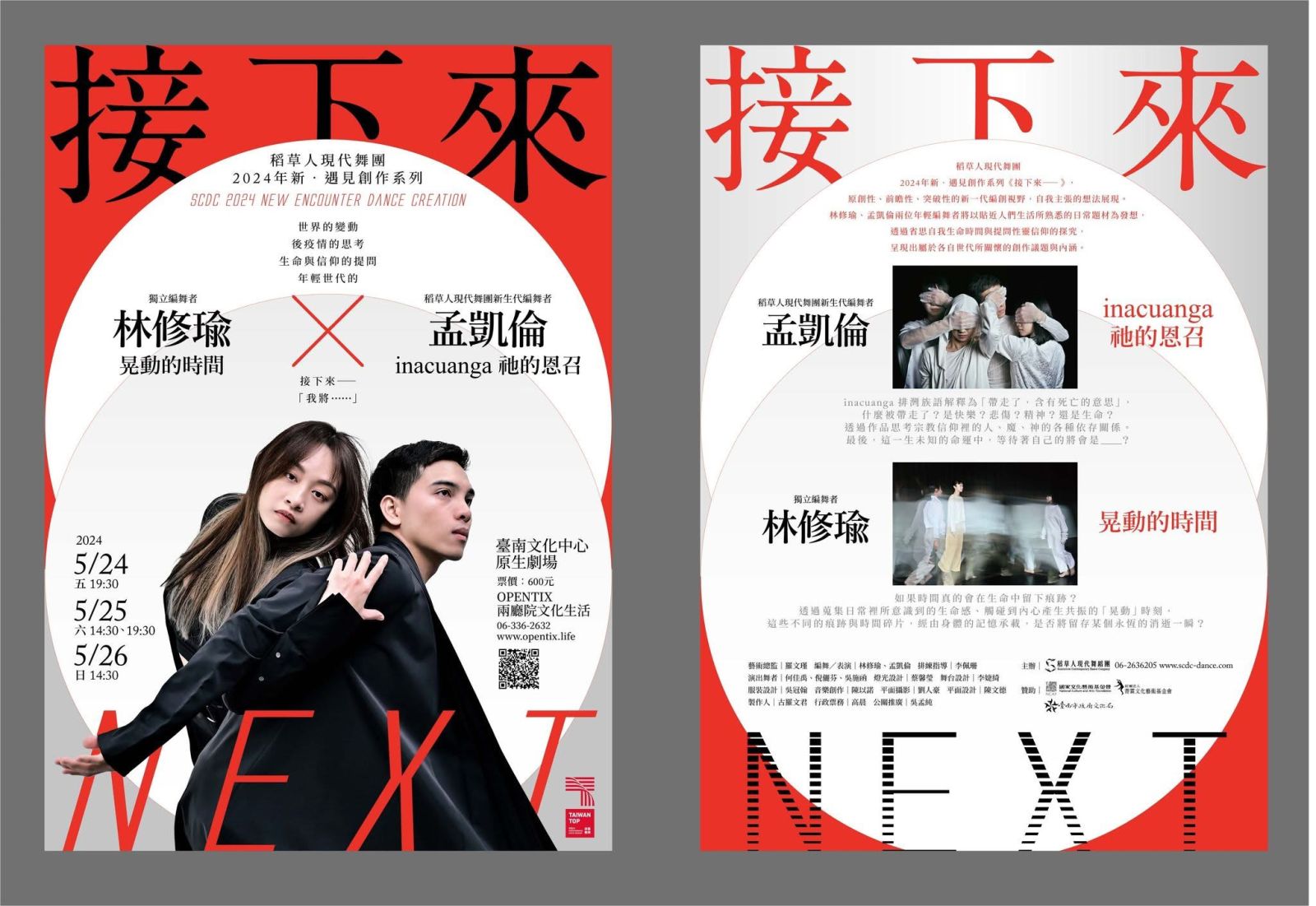 稻草人現代舞團2024年新‧遇見創作系列《接下來──》,將由自2019年加入稻草人舞團的核心舞者團員孟凱倫、獨立編舞者林修瑜以雙舞作的演出形式,分上下半場發表兩人各自所展現出的獨特創作風格與想法的舞作。林修瑜將重新創作曾在2018年獲選國藝會「新人新視野」的首部中篇創作《是日》,將這五年多間歷經世界各種變化與疫情諸多衝擊的感受與影響,重新思考時間與生命的關聯所編創的新作《晃動的時間》。孟凱倫以排灣族語inacuanga所代表的意涵「被拿走了、被帶走了,含有死亡的意思」為發想,對人的各種「宗教信仰」提出疑問,反思人、魔、神的各種依存關係,創作出新作《inacuanga 祂的恩召》。兩位年輕編舞者皆以貼近人們生活所熟悉的日常題材為發想,透過省思自我生命時間與提問性靈信仰的探究,呈現出屬於各自世代所關懷的創作議題與內涵。