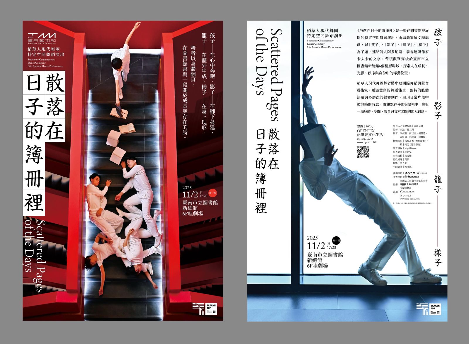 《散落在日子的簿冊裡》是一場在圖書館裡展開的特定空間舞蹈演出,由編舞家羅文瑾編創,以「孩子」、「影子」、「籠子」、「樣子」為子題,連結詩人阿多尼斯、聶魯達與作家卡夫卡的文字,帶領觀眾穿梭於臺南市立圖書館新總館6個樓層場域,探索人在成長、光影、秩序與身份中的浮動位置。